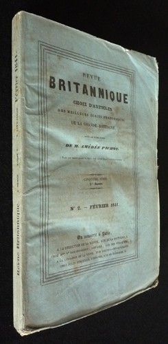 In-8 (14,5 x 22,5 cm), broché, numéro de février 1841 de la Revue britannique, avec au sommaire : Les Orateurs américains. Le roi de Bath. Les Squatters. Des Douanes et de leur influence sur le revenu public, la production et les échanges (1). Superstitions populaires du pays de Galles. Nouvelle théorie des ouragans, moyens de les prévenir et de les éviter (1). La Fiancé de Barna. Nouvelles des sciences, de la littérature, des beaux-arts, du commerce, de l'industrie, de l'agriculture, etc. Dernières nouvelles de l'Inde. Les Principautés de Valachie et de Moldavie sous le gouvernement de Paul Kisseleff. Chronique littéraire de la Revue britannique et bulletin bibliographique ; plats froissés, bords des plats usés, dos fendu aux coiffes, état correct.