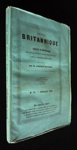 In-8 (14,5 x 22,5 cm), broché, numéro de juillet 1840 de la Revue britannique, avec au sommaire : De la canalisation des isthmes de Suez et de Panama. Les Cerfs d'Ecosse. Des travaux publics aux Etats-Unis. La Laponie et les Lapons. L'Epée brisée. Sylvio ou le coup réservé. La Flotte turque. Les Bazars de Bombay. Dernières nouvelles de l'Inde. Nouvelles des sciences, de la littérature, des beaux-arts, du commerce, de l'industrie, de l'agriculture, etc. Chronique littéraire de la Revue britannique et bulletin bibliographique ; coiffes, coins et bords des plats usés, quelques marques d'usage sur les plats, assez bon état général.