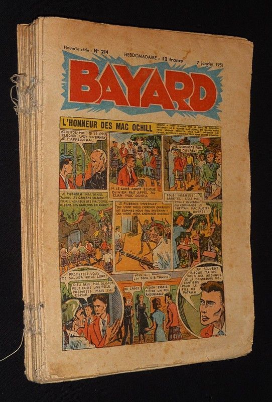 In-4 (19 x 27 cm), revue en feuilles, lot de 20 numéros de "Bayard", du n°214 (7 janvier 1951) au n°233 (20 mai 1951) ; les numéros sont cousus ensemble (sans doute extraits d'une ancienne reliure) mais détachables ; petites déchirures et pliures sur les bords des premiers et derniers feuillets, par ailleurs assez bel état général.