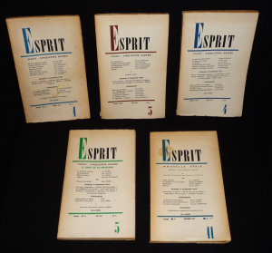 In-8 (14 x 22,7 cm), brochés, lot de 5 numéros de l'année 1957 de la revue "Esprit" : n°1 (janvier), n°3 (mars), n°4 (avril), n°5 (mai) et n°11 (novembre) ; dos brunis, quelques traces sur les plats et dos, par ailleurs assez bon état général.