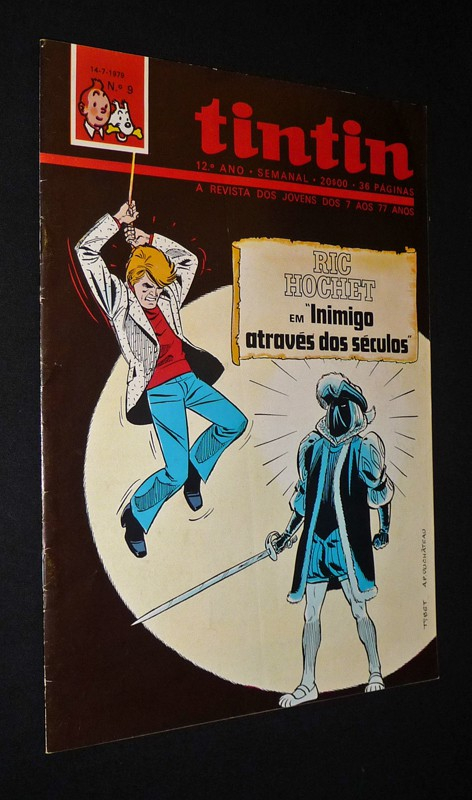 In-4 (19 x 27,5 cm), dos agrafé, version en portugais de la revue Tintin, n°9 du 14 juillet 1979 : quelques petites traces et marques d'usage aux plats, bon état.