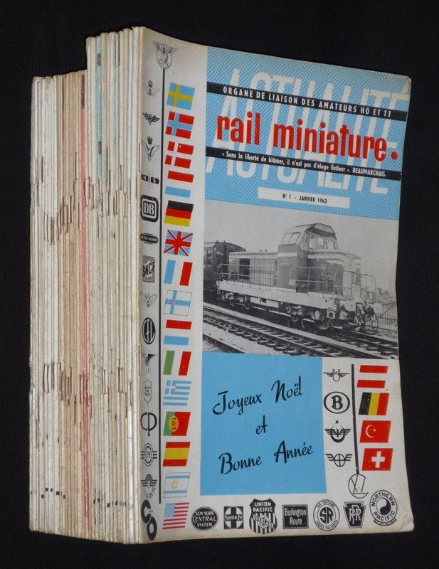 In-4 (21 x 29 cm puis 21 x 27 cm), dos agrafé, 33 numéros de la revue "Rail Miniature Actualité" (renommée par la suite "Rail Miniature Flash", du n°1 (janvier 1962) au n°35 (février 1965), SAUF les n°23 et 24 ; dos frottés, quelques petites traces et marques d'usage sur les plats, bon état général.