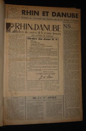In-folio (29,5 x 43 cm), reliure pleine toile, n°1 à 52 (juin 1946 - mars 1951) de Rhin et Danube, bulletin de l'Amicale des Anciens de la 1re Armée française, avec le bulletin des Anciens annonçant la naissance de la revue ; plats un peu incurvés, quelques traces et marques de frottement sur la toile, dernière garde désolidarisée, par ailleurs assez bon état général.