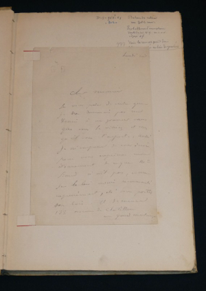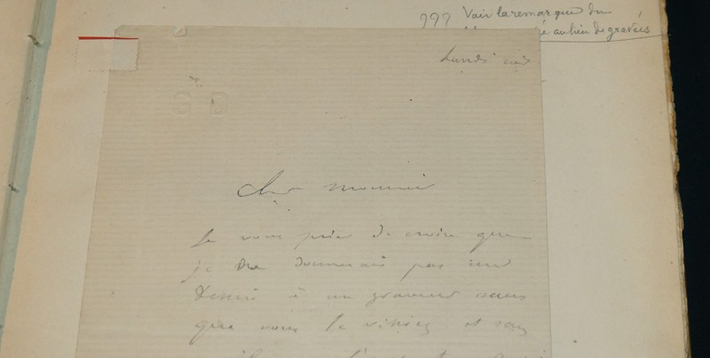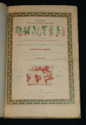 LETTRE MANUSCRITE DE GUSTAVE DORE. "Histoire dramatique, pittoresque et caricaturale de la sainte Russie, d'après les chroniqueurs et historiens Nestor, Nikan, Sylvestre, Karamsin, Ségur, etc. commentée et illustrée de 500 magnifiques gravures de Gustave Doré gravées sur bois par toute la nouvelle école sous la direction générale de Sotain, graveur de l'histoire de Russie, de batailles, de protraits, de paysages, de genre, de fleurs, d'animaux, de crustacés et de plantes rares". Un volume in-4 (20,8 x 31 cm), reliure pleine toile beige de Behrends, dos lisse orné d'une pièce de titre et d'un fer estampé à froid, ex-libris de Maurice Decroix, couverture conservée, 207 pages imprimées uniquement au recto, la page 89 porte la tache rouge caractéristique de l'édition originale rare et recherchée de cet ouvrage satirique critiquant les menées de la Russie en Europe, notamment en Crimée, qui fut par la suite censuré par le gouvernement de Napoéon III en 1856. Il est aussi considéré comme la première bande dessinée française. Notre exemplaire est en outre doté d'une lettre manuscrite de Gustave Doré à son éditeur. "Cher Monsieur, je vous prie de croire que je ne donnerais pas un dessin à un graveur sans que vous le vissiez et sans qu'il vous l' [apporte?]. Aussi je m'empresse de vous écrire pour vous exprimer mon étonnement de ce que M. Viand n'ait pas, comme je le lui ai recommandé expressément, été vous porter son bois. Il [demeure?] 133 avenue de Châtillon au Grand Montrouge. Vous aurez demain deux nouveaux dessins sans faute. Votre bien dévoué, Gustave Doré ; dos bruni, rousseurs et taches aux plats, manque dans le coin inférieur de la page 49 avec légère atteinte de quelques mots au texte et sans atteinte à l'illustration, par ailleurs intérieur frais et bien conservé, bel exemplaire.