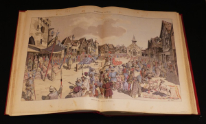 Trois volumes in-folio, pleine toile rouge de l'éditeur, dos et plats magnifiquement illustrés en noir et or par Souze, (ENGEL), belle couverture illustrée (Luigi Loir) en couleurs conservée dans le premier volume, 324-324 et 320 pages, nombreuses illustrations à pleine page et dans le texte dont certaines dessinées par ROBIDA, 119 planches à double page hors-texte dont 31 en couleurs, grandes planches dépliantes rehaussées ; plats à peine frottés, ors éclatants, mors supérieur du volume 2 restauré, et une tache noire en bas du premier plat, très bel exemplaire auquel on joint le bulletin de souscription de l'époque.