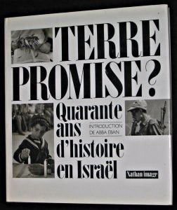 In-4 carré, cartonné sous jaquette illustrée, 200 pp., histoire d'Israël, à travers de magnifiques photographeis noir & blanc, introduction de Abba Eban ; excellent état.