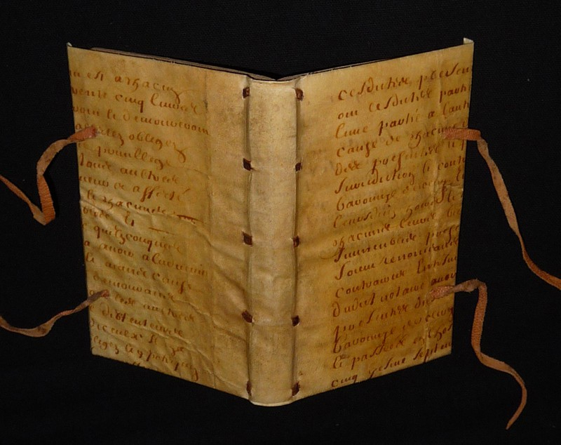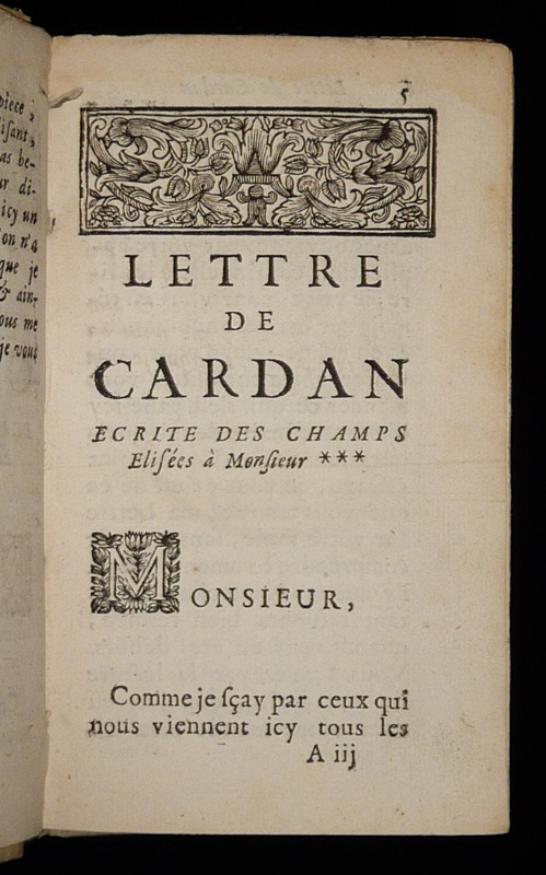 In-12 (9,2 x 15 cm), reliure XXe siècle refaite à la manière à l'aide d'un parchemin ancien, édition originale (1691), 202 pp., on trouve par ordre de lecture les textes suivants : "Lettre de Cardan, écrite des Champs Elisées à Monsieur ***" puis "Les Intrigues d'Arlequin, comédie" ; très bel exemplaire.