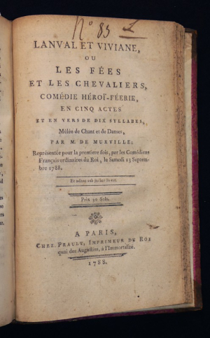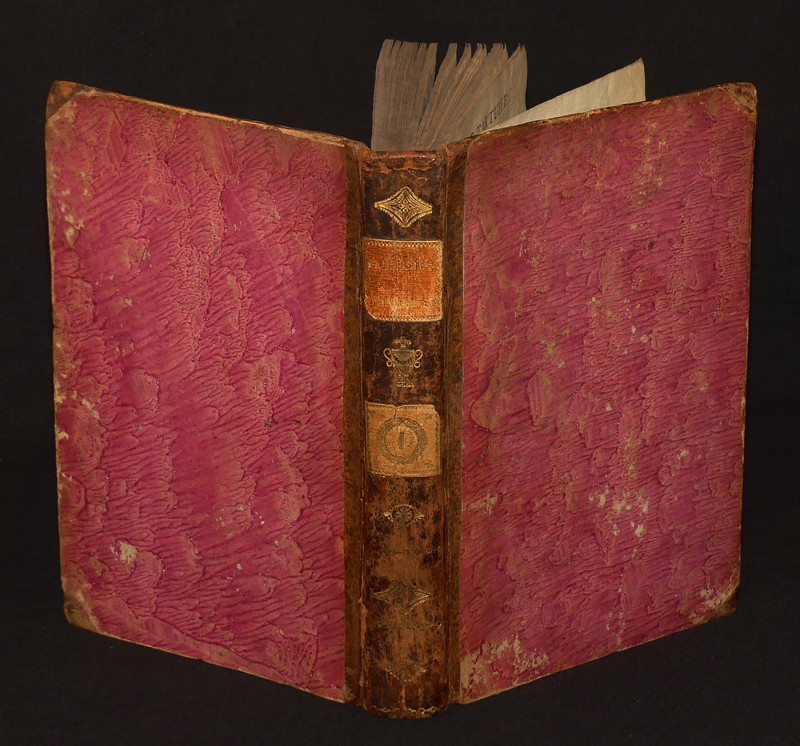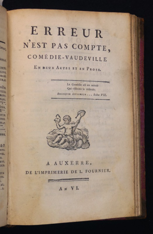 In-8 (13 x 20 cm), demi-reliure à coins, décors au dos avec pièces de titre ("Comédies diverses") et tomaison, quatre pièces réunies en un volume, 1er volume : 69 pages, paru l'an II, semble être la 1è édition parue à l'insu de l'auteur (Il s'agit d'une ''édition imprimée sans l'autorisation de l'auteur. C'est une contrefaçon tronquée, dont la parution poussa les amis de l'auteur à publier la suivante à l'insu même de Beaumarchais. La première édition avouée par l'auteur a paru en 1797. Malgré la mention ''édition originale'' portée en page de titre, cette édition n'est pas la première'' (in Tchemerzine)) // 2e vol. : Les épreuves, comédie en un acte et en prose, mêlée de vaudeville par les citoyens Henrion & Ad. R***, 36 pages, paru l'an IX // 3e vol. : Erreur n'est pas compte, comédie-vaudeville en deux actes et en prose, an VI, 34 pages // 4e vol. : Les marches de Philis, pastorale en vaudeville et en un acte, par le cit. Heniron, an IX - 1801, 38 pages // 5e vol. : L'amant auteur et valet, comédie en un acte et en prose, chez Fages, an IX, 32 pages // 6e vol. : Jugements sur Lekain, par Molé, Linguet... ou supplément aux mémoires de ce grand acteur, chez Colnet, Debray, Mongie, 74 pages // 7e vol. : Lanval et Viviane ou les fées et les chevaliers, comédie héroï-féerie, en cinq actes et en vers de dix syllabes, mếlée de chant et de danses, chez Prault, 1788, 74 pages ; frottements aux bords et aux plats, légères rousseurs en début d'ouvrage, assez bon état.