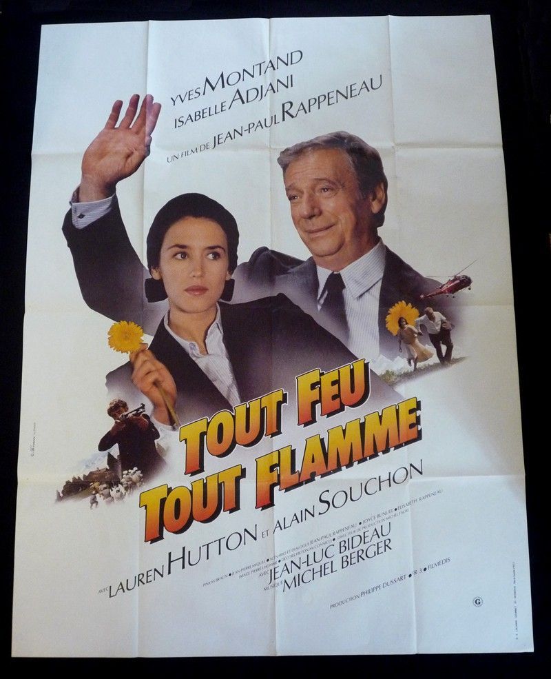 Affiche (env. 120 x 160 cm) du film Tout feu tout flamme (1982) réalisé par Jean-Paul Rappeneau ; quelques petites traces et marques d'usage au niveau des pliures, assez bon état.