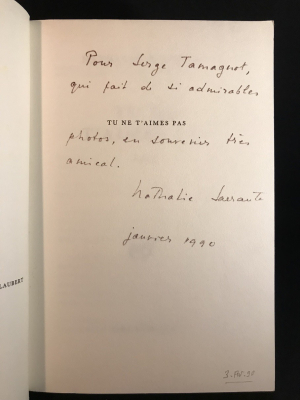 In-8 (14 x 20,5 cm), broché, 216 pages, édition originale, joli envoi autographe de l'autrice à Serge Tamagnot signé et daté : « Pour Serge Tamagnot, qui fait de si admirables photos, en souvenir très amical. Nathalie Sarraute janvier 1990 » ; bon état.