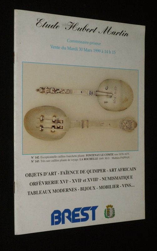 Etude Hubert Martin - Vente du 30 mars 1999 : Objets d'art, faïence de Quimper, art africain, orfèvrerie XVIe , XVIIe et XVIIIe, numismatique, tableaux modernes, bijoux, mobilier, vins