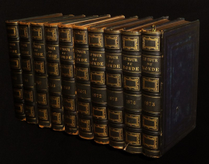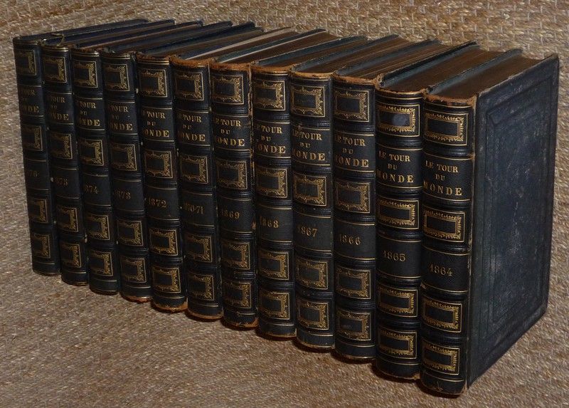 9 volumes in-4 (23,5 x 30,5 cm), reliure demi-chagrin, dos à 5 nerfs ornés de caissons dorés, plats de percaline chagrinée, tranches dorées, cet ensemble comprend les années 1866 à 1875 de la revue "Le Tour du Monde", illustrations en noir et blanc ; quelques épidermures sur le cuir (aux mors et coiffes principalement), plats et coupes frottés sur l'ensemble des volumes, quelques rousseurs éparses à l'intérieur, assez bon état général.